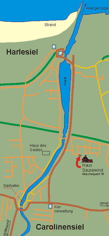 Haus Sausewind liegt an einer Sackgasse am Rande einer ruhigen Siedlung zwischen dem Zentrum Carolinensiel und Harlesiel.